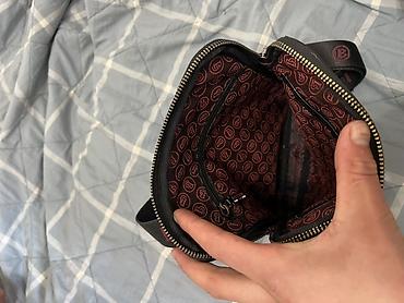 - Внутри: подкладка с фирменным принтом, один большой отсек, внутренний карман на молнии и открытые кармашки для мелочей/смартфона