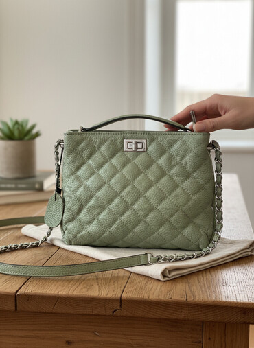- Декор: ромбовидная стёжка по всему корпусу, кожаный брелок‑бирка в тон.