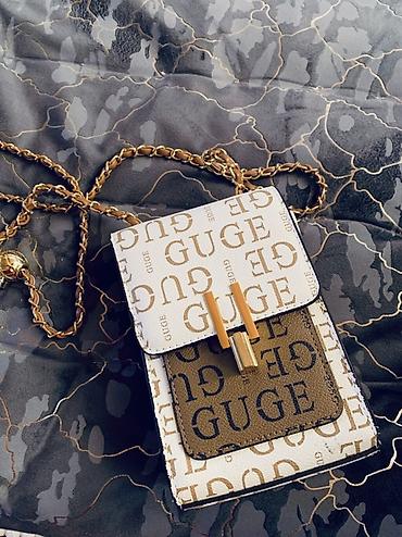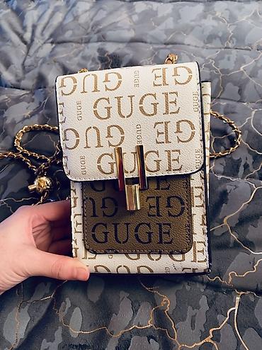 - Дизайн: контрастный принт «GUGE» по всему корпусу; накладной карман спереди в оливковом цвете.