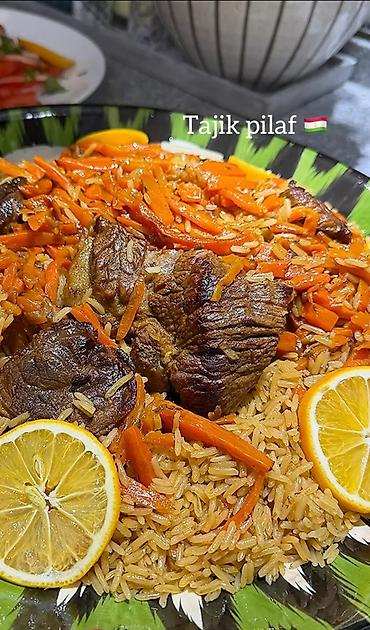 Ароматный рассыпчатый плов по‑таджикски: длиннозёрный рис, сочная морковь, нут, лук, крупные куски мягкой говядины. Обжарка на растительном масле с традиционными специями (зира, барбарис, чеснок) для глубокого, насыщенного вкуса. Подача на большом блюде, уместна для семейного стола и праздников; возможно оформление с дольками лимона для свежей нотки.