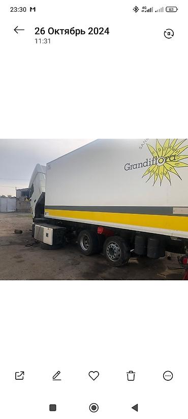 - Полуприцеп/надстройка: изотермический рефконтейнер с двухстворчатыми задними дверями. Боковые и задние поверхности с фирменной ливреей Grandiflora/Universo.