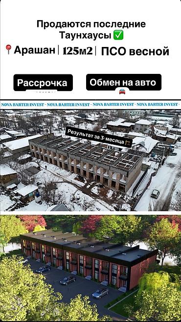 Таунхаусы площадью 125 м2 , объект находится в селе Арашан, всего 15 км от Бишкека. Сдача планируется весной 2026 года