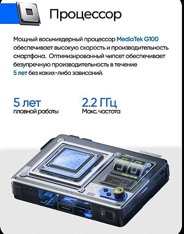 - Процессор: восьмиядерный MediaTek Helio G100 Ultimate, тактовая частота до 2.2 ГГц. Оптимизированный чипсет для стабильной производительности.