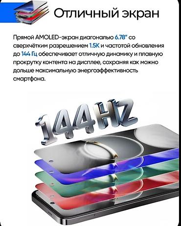 - Экран: прямой AMOLED 6.78", разрешение 1.5K, частота обновления до 144 Гц — плавная прокрутка и высокая энергоэффективность.