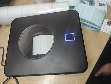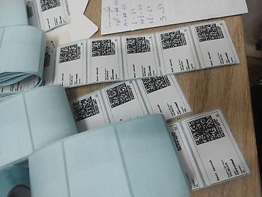 - В комплекте рулоны белых самоклеящихся этикеток (на фото — прямоугольные ярлыки с черной термопечатью).