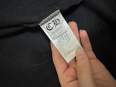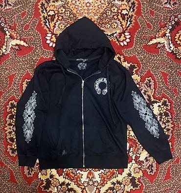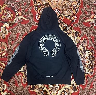 - Принт: фирменные белые графические элементы Chrome Hearts — крупный логотип-подкова на спине, малый логотип на груди, орнаменты с крестами на обоих рукавах