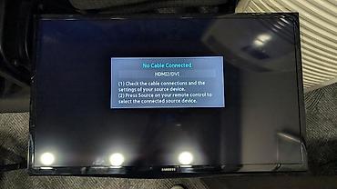 Подходит для подключения приставок, медиаплееров, ПК и игровых консолей по HDMI/DVI. Компактный 32" формат — оптимален для кухни, спальни или дачи. На фото показан рабочий экран с сообщением «No Cable Connected» при выборе входа HDMI/DVI.