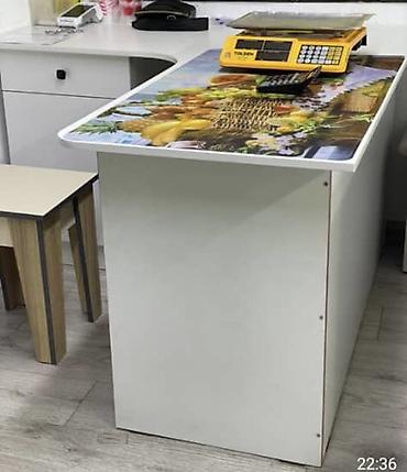 - Прикассовая стойка/остров с пластиковым декором на столешнице, удобная для размещения весов и терминала.