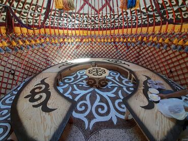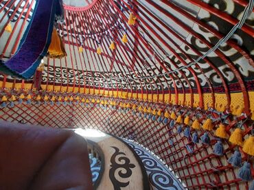 - Каркас: решётчатые стены (кереге) из дерева, дуги окрашены, купол со световым отверстием (шукура/түндүк). Прочные поясные ремни и декоративные ленты.