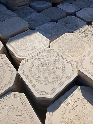 - Формат: крупная восьмигранная плита с декоративным рельефным орнаментом и фаской по периметру. Предусмотрены квадратные вставки-клинья для раскладки (контрастные элементы на стыках).
