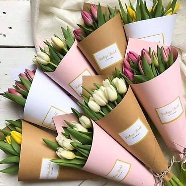 Тюльпаны свежесрезанные — разноцветные букеты в крафте. - Ассортимент