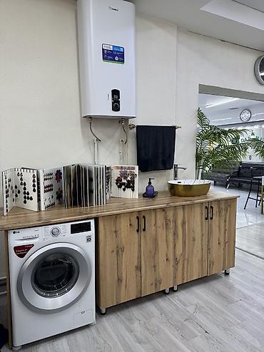 - Предметы на фото (раковина накладная, смеситель, стиральная машина, бойлер, аксессуары) показаны для демонстрации совместимости — основа комплекта: тумба с рабочей столешницей и секциями хранения.