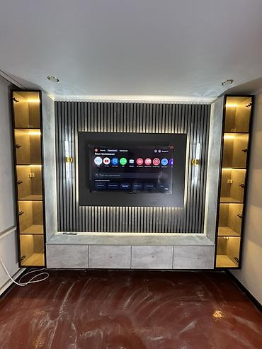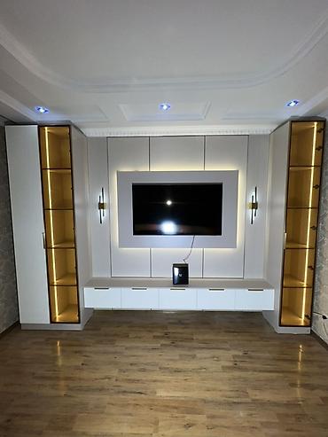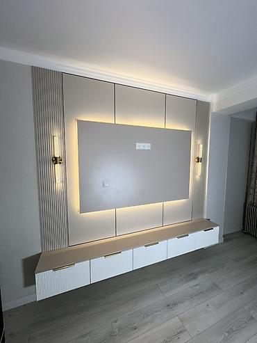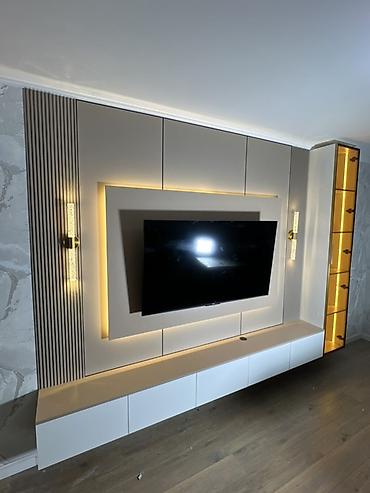 Современный комплект мебели для гостиной и спальни в едином минималистичном стиле. Состав и особенности: - ТВ-зона подвесная тумба с четырьмя выдвижными секциями, подсветка нижнего контура. - Витр...