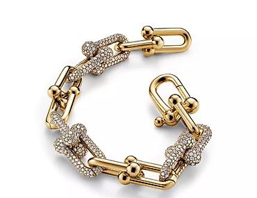 - Браслет: массивные овальные звенья с гладкой полированной поверхностью в тёплом золотистом оттенке, чередуются с звеньями, усыпанными мелкими прозрачными кристаллами. Акцент — объемные шарообразные элементы на каждом соединении, создающие графичный рельеф и игру бликов. Застёжка выполнена в виде крупного звена, визуально продолжающего дизайн.