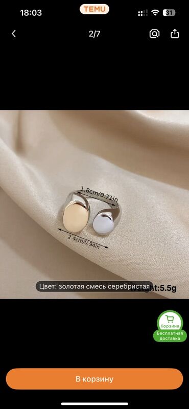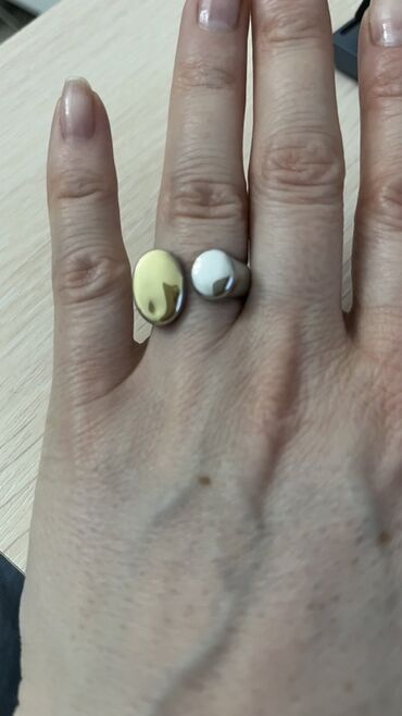 - Дизайн: асимметричное открытое кольцо с двумя гладкими выпуклыми площадками — одна золотистая, другая серебристая. Современный минимализм, акцентный аксессуар.