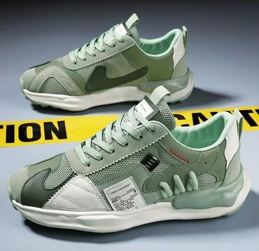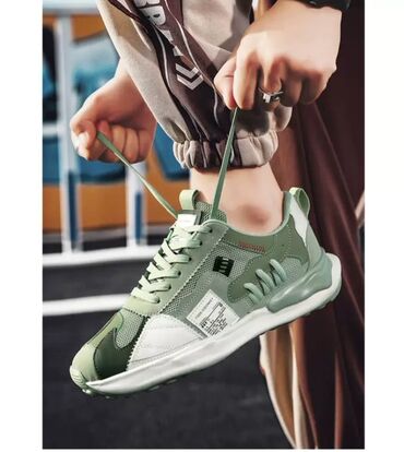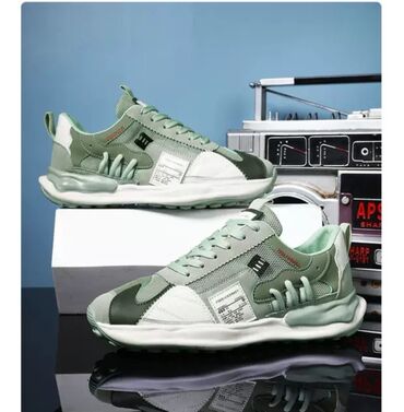 Кроссовки в уличном стиле, цвет — оттенки мяты/оливы с белыми акцентами.