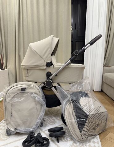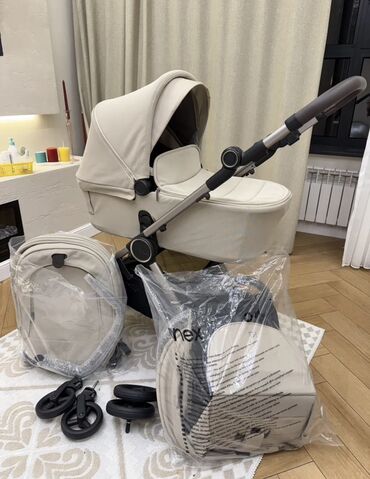 В комплекте на фото: рама, люлька, прогулочный блок (текстиль и капюшон), набор колёс, корзина для вещей, бамперы/крепления. Цвет — светлый беж.