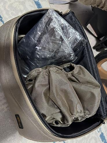 - Сумка‑органайзер в цвет коляски с аксессуарами внутри (видны дождевик/плёнка и дополнительные элементы).