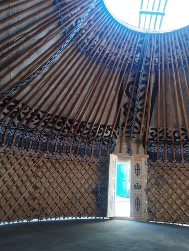 - Каркас: деревянный решётчатый кереге с гибкими дугами-уык, купольное перекрытие с центральным световым/дымовым отверстием (шанырак). Элементы связаны плетёными ремнями и шнуром.