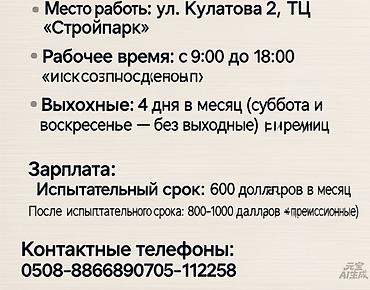 Требуется продавец консультант, девушка возраст от 20 до 30 лет. рабочий время с с 8:30 до 20:30 5/2. зарплата от 29.000 до 40.000. языка знающий кыркызский и русский. пишите на вотсап