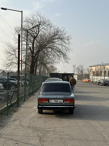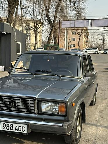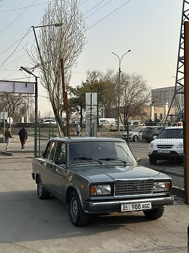 ВАЗ 2107, седан классической серии. Цвет – темно‑серый металлик. Кузов четырехдверный, прямые формы с хромированными элементами: окантовка решетки радиатора, молдинги, бамперы. Фары прямоугольные, отдельные указатели поворота спереди и сзади.