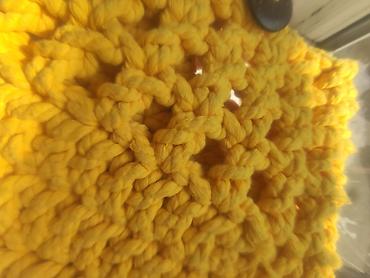 - Техника: крупная вязка крючком, фактурный узор с воздушными «окошками» в верхней части и более плотным донышком для удержания формы.