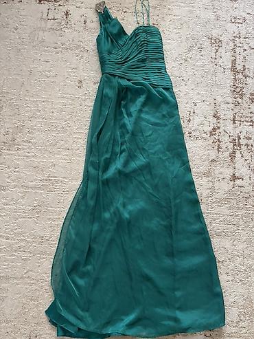 Вечернее платье из струящейся ткани бирюзово-изумрудного оттенка.