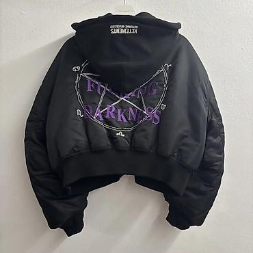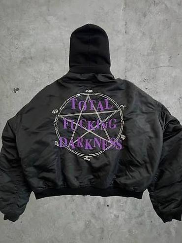 - Нашивки/вышивки: логотип Vetements на капюшоне, надпись на груди; на спине крупный принт “TOTAL F****** DARKNESS” с пентаграммой в фиолетовом и белом цветах; на рукаве длинная вышивка красным.