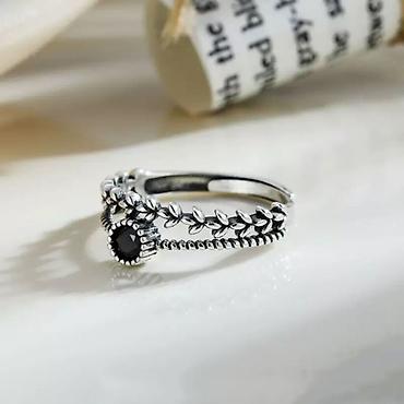 Это двухслойное кольцо из серебра S925 с эффектом чернения — находка для любителей эстетики Dark Luxury и винтажного стиля. Оно объединяет в себе изящную веточку и классическую дорожку с глубоким черным кристаллом.
