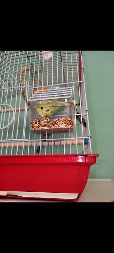 - Корм: зерносмесь для волнистых (видна в прозрачной кормушке).