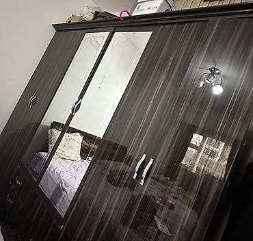 - Шкаф-купе/распашной 4‑дверный с зеркалами по центру. Внутри — отделения для одежды, штанга для вешалок, выдвижные ящики в нижней части. Металлические ручки.