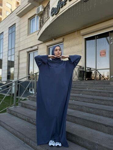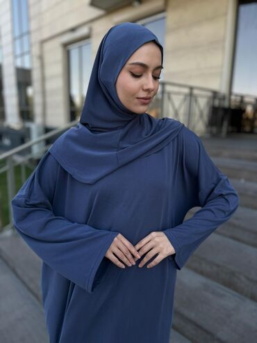Абая с хиджабом из мягкой струящейся ткани с благородным сатиновым отливом. Цвет — пыльно‑серо‑голубой с золотистым растительным принтом «деревца» по всей поверхности. Особенности: - Комплект: сво...