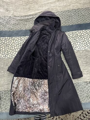 Женское длинное пальто/парка с капюшоном, темно-серого цвета.