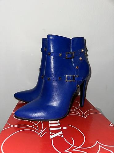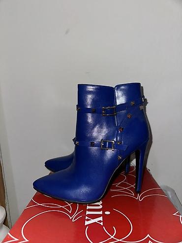 - Синие: гладкая кожа, насыщенный кобальтовый цвет. Узкие ремешки с металлическими заклёпками и пряжками вокруг щиколотки. Зауженный нос, высокая шпилька. Верх до щиколотки.
