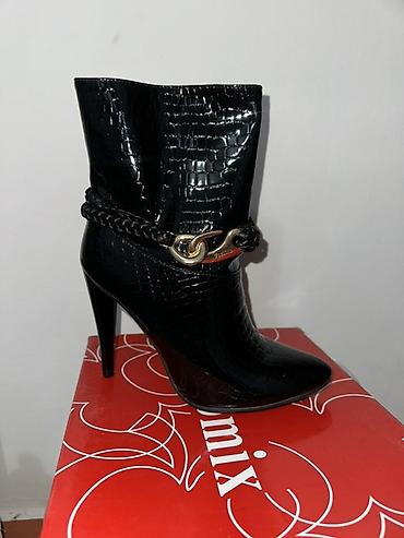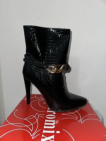- Чёрные: лаковая фактура под рептилию. Декоративный плетёный ремень с массивной металлической цепочкой спереди. Зауженный нос, высокая шпилька. Верх чуть выше щиколотки.