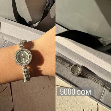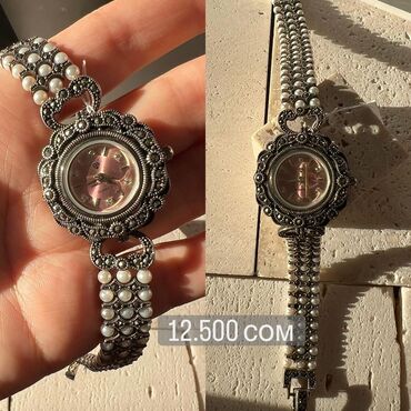 - Круглый корпус в винтажном стиле, безель с маркаситами, браслет с декоративными «жемчужными» вставками — 12 500 сом.