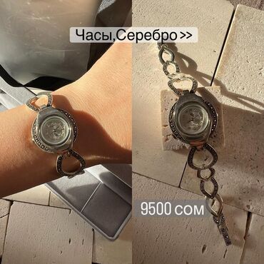 - Модель с овальным корпусом и фигурными звеньями браслета, инкрустация тёмными маркаситами — 9500 сом.