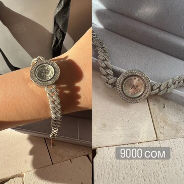 - Круглый корпус с двойным рядом камней по безелю и браслету, лаконичный классический стиль — 9000 сом.