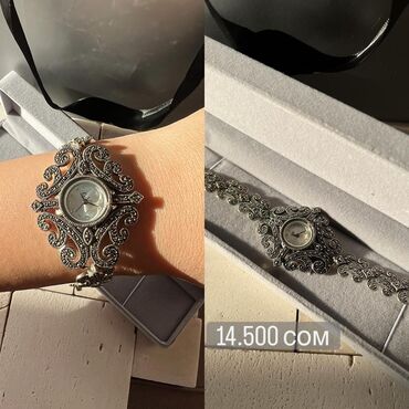 - Ажурная модель с крупным декоративным корпусом и узорным браслетом с маркаситами — 14 500 сом.