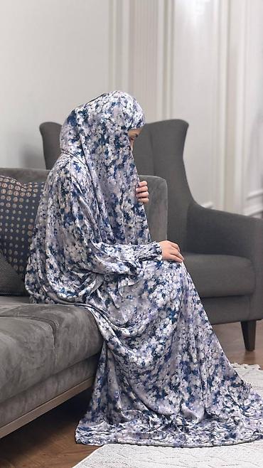 - Нежный «акварельный» цветочный принт в серо‑голубой гамме.