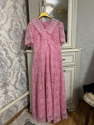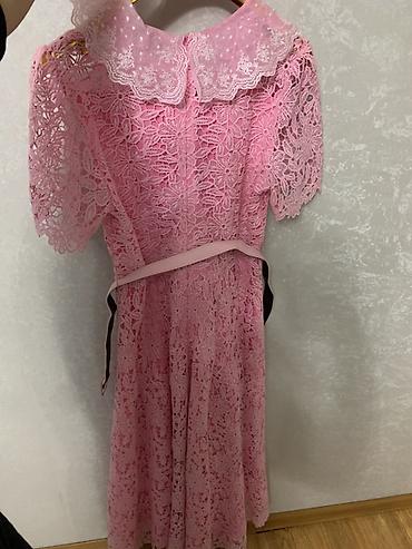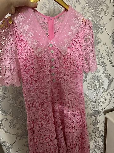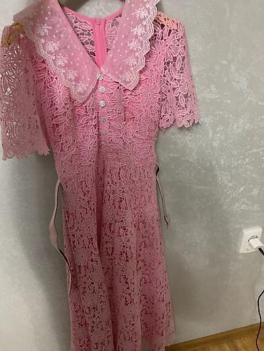 Ажурное розовое платье миди с короткими рукавами и отложным воротником