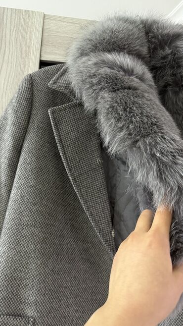 Женское пальто LORETA, размер 38. - Длина: миди. - Цвет: серый меланж. - Прямой силуэт, скрытая застёжка на кнопки. - Тёплая стёганая подкладка шоколадного цвета. - Объёмный меховой воротник (съём...