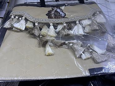 - Конструкция: верхний ламбрекен с бахромой и кисточками по краю, фигурная отделка тесьмой; стёганая фактура материала.