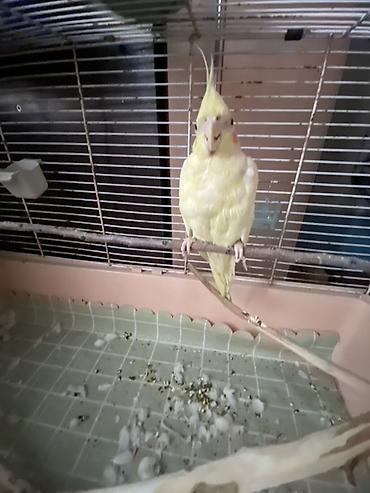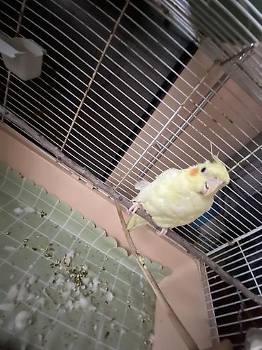 Нимфа (корелла) светло‑жёлтого окраса с оранжевыми щёчками в комплекте с клеткой и аксессуарами.с клеткой