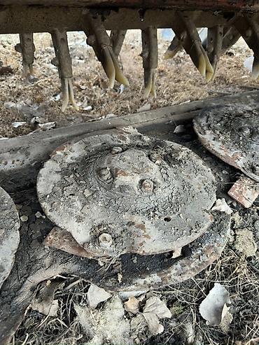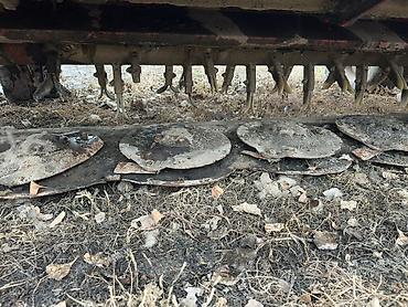 - Широкий косильный модуль с дисковым режущим брусом: несколько дисков с ножами, нижняя защитная полосa и башмаки скольжения.