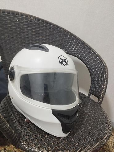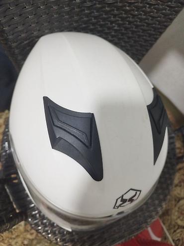 Подойдёт для городских и трассовых поездок на мотоцикле/скутере. Цвет — матовый/сатиновый белый с чёрными акцентами. Размер визуально ближе к M–L (ориентируйтесь по обхвату головы).
