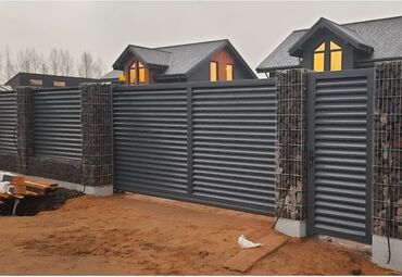 Функциональные, долговечные и эстетичные ворота, сочетающиеся с каменными, габионами и бетонными секциями забора. Подходят для современных и классических фасадов.