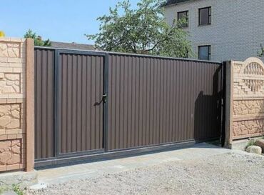 - Компоновка: створка ворот откатывается вдоль забора; калитка вынесена в отдельную секцию с ручкой и замком.