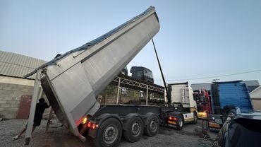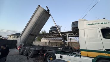 Самосвальный полуприцеп Тонар (синего цвета), трехосный. Основные характеристики по фото: - Кузов полукруглый стальной, рассчитан на перевозку сыпучих и инертных материалов (песок, щебень, грунт, ...