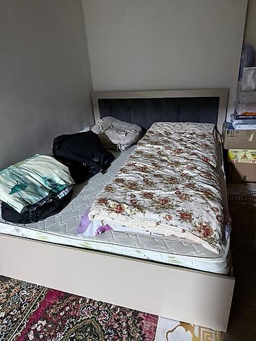 - Кровать двуспальная с высоким мягким изголовьем (вставка темно‑серая/графитовая велюровая панель) и прямым бежевым каркасом. Виден пружинный/пеновый матрас стандартной высоты.